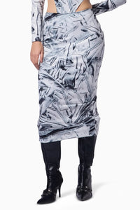 This trompe l'oeil print skirt features a unique crushed paper scanned print, creating a visually captivating effect. The skirt is designed with a side zip for ease of wear and is made from stretchy, body-hugging fabric that flatters your figure. The black and white color combination adds a modern and bold touch.