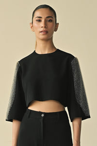 Featuring a chic crop top with a round neckline design, this piece comes with elbow-length sleeves adorned with PVC hand embroidery. A back zip closure ensures ease of wear while maintaining a sleek, structured look.