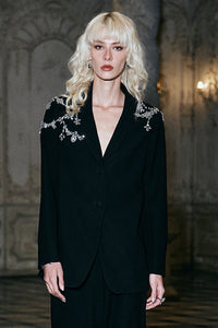 Black tailored blazer with hand-applied crystal swarovski embellishment. Placed along the shoulders, extending softly onto the sleeves across the front and back. Lapel collar with a sharp, structured finish. Long sleeves and self-fabric buttons at the front. Garment is fully lined