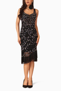 Showcasing Shriya Som's fringe dress from the Chrysalis Collection, crafted in a tulle base and embellished with radiant multicolor crystals. The design is elevated with a unique asymmetric hemline, blending glamour with contemporary elegance.