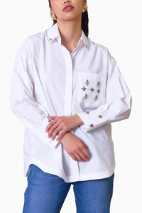 A classic white shirt featuring elegant jewel embellishments on the pocket, collar, and cuffs. Designed for effortless sophistication, it blends timeless style with a touch of shimmer, perfect for both formal and semi-casual looks.