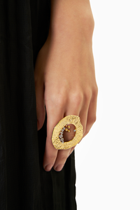 The product is finished in Gold Polish. Avoid contact with water & perfume. Can show signs of tarnish over time with exposure to moisture/sweat.