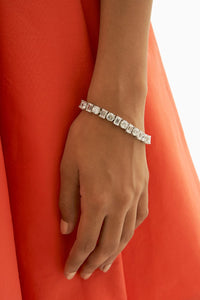 Wear this gorgeous accessory to amplify your formal style or add a hint of grace to your casual style with this soft tennis bracelet with round & emerald cut clear crystals set in silver. It is a perfect piece of jewellery for a day you want to shine.