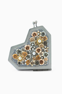 The luxurious grey fabric is embroidered with gold, silver and dark metal petals draping each metallic flower. The geometric heart’s base is made of metallic sequins and stones, with layers of textural opulence on top. This all-season accessory will lend you a helping hand with not just essentials, but with taking your style up a notch too. No matter what you put in it, necessities or secrets, there will always be extra room for glamour.