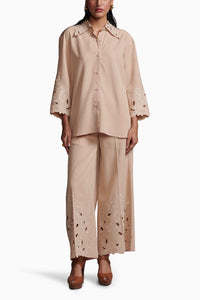 Sand shirt in sustainable, breathable Tencel. Features tonal embroidery and scalloped cutwork on the collar and sleeve hem. Relaxed fit with side slits and an inverted box pleat at the back. Front button-down placket. Paired with Sand wide-leg pants in sustainable, breathable Tencel. Features tonal embroidery and scalloped cutwork on the front hem. Relaxed fit with side pockets. Semi-elasticated waist with hook-and-eye and zip closure.