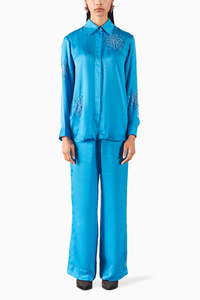 The Brunia Shirt & Trousers Co-ord crafted from our stunning Vegan Silk fabrication, trans-seasonal, is a statement piece. Made in our hand dyed vegan silk, it is a 2 piece set. With a front button opening and embroidered swarovski in a snowflake pattern, it is chic. Featuring a straight fit, this shirt can be styled in different ways. Paired with our matching Brunia Trousers with pockets. Wear it with heels for an elegant look.
