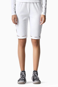 The Ribbed Shorts features a high waist and elasticated waistband cut in a ribbed stretch lycra. Enhanced with hand embroidered beads along the side seam and hem.