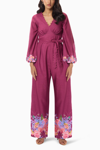 A ‘cannot-go-wrong’ linen jumpsuit that screams comfort with a hint of floral poise. With voluminous sleeves and a flattering V-neckline. The tie-up belt adorned with delicate lace accentuates the waist, while the wide-leg silhouette offers freedom of movement. Featuring side pockets and an invisible zip closure at the back, it seamlessly blends style and functionality.