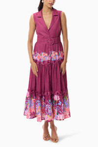 This fit and flare midi dress combines timeless elegance with functionality, featuring floral lacing for a touch of sophistication. Its versatile length effortlessly transitions from casual to formal occasions. With a tiered flowy skirt, notch lapel, and a buckled belt for a stylish fit, it also offers practical elements like side pockets and a button-down front. Comes with a separate slip crafted from cotton voile, and adorned with rose lace detailing across the skirt's body.