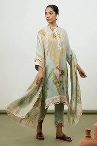 The Cypress Sky Kurta Set pairs a relaxed cotton silk kurta with asymmetric hem pants and a lightweight Chanderi dupatta. Finished with appliqué lace embroidery, it’s a breezy, elegant look perfect for daytime celebrations.