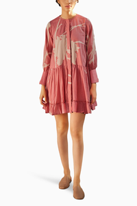 Featuring a pale pink mulmul short dress with long cuffed sleeves and a frilled hem. Cut in our lino print fabric and comes completely lined with an invisible placket at front.