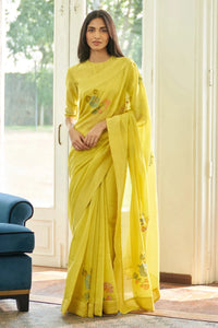 The Daffodil Appliqué Floral Saree, bathed in a sunlit hue, is adorned with delicate appliqué blooms and fine thread detailing across the drape. Paired with a matching blouse for a quietly festive finish. This saree comes with an unstitched blouse piece.