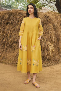 The Daffodil Pintuck Dress, in soft sunlit hues, flows effortlessly with its breezy silhouette. Pintucks at the neckline lend a refined touch, while contrasting floral embroidery along the hem and cuffs adds delicate charm. Perfect for a relaxed brunch or an evening stroll.