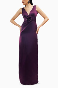 Featuring Dahlia Deep V Neck Dress With A Rose by Brinda Sneha by their Love Locked Collection. It's a signature full-length gown with a V-neckline at the front, complemented by a deep V-back adorned with elegant buttons. A rosette at the center front adds a touch of romantic detail, while a subtle slit at the back of the straight skirt ensures ease of movement and a hint of allure. Perfect for making a stunning entrance at events like engagements, prom, and birthdays.