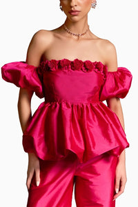 Add a touch of romance to your wardrobe with this pink off-shoulder Dahlia top. Adorned with beautiful rose details on the bust and a playful fluffy frill, it exudes feminine charm. The convenient zipper at the back ensures a perfect fit, making it an ideal choice for both casual outings and special occasions.
