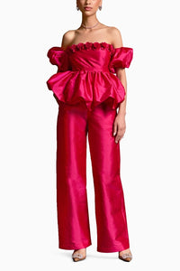 This charming set combines the romantic Dahlia top, featuring rose details and playful frills, with the sleek Vista wide-leg pants. Designed for comfort and elegance, it's perfect for festive events or stylish outings.