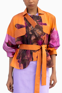 Experience edgy style with a touch of elegance in our Dahlia Silk Biker Jacket. Crafted from luxurious Muslin silk, this classic piece boasts a striking Dahlia flower print. The perfect combination of tough and delicate, it features a metal zipper, notch lapel, and waist belt. Length: 26 Inches