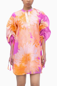 Expertly designed for summer, the Dahlia Sorbet Dress features a statement print and ruched string sleeves for a relaxed fit. The adjustable sleeve length and 35-inch length make it both comfortable and stylish. Perfect for any warm weather occasion.