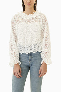 White laser cut long sleeve top with a tie behind open back. Featuring a high neck ruffled collar, a sexy back and laser cut detail.