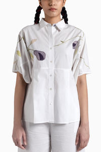 Dai, a natural-hued poplin shirt adorned with contrasting appliqués of purple and green motifs made in silk and Chanderi fabrics.