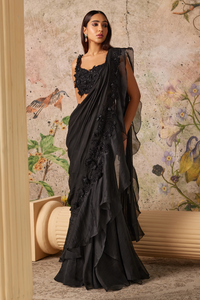Elevate your style with our exquisite Saree Set featuring a Net Embroidered Blouse paired seamlessly with a Chiffon Draped Saree adorned with delicate Organza Ruffles. This monotone handwork ensemble exudes sophistication, with meticulous embroidery enhancing the allure of the drape. Perfect for special occasions and festivities, this saree set effortlessly combines traditional craftsmanship with contemporary design. The lightweight chiffon draping and intricate details make it a comfortable yet stylish choice. Make a statement at any event with this stunning saree set that promises to captivate attention and leave a lasting impression.