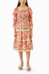 One of our gorgeous dresses ever. A vision of feminine romance, smoked bodice, delicate lace detailing and off the shoulder neckline.
