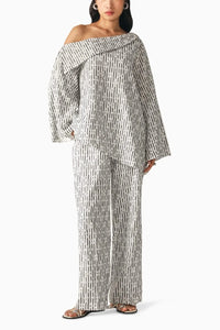 An effortlessly chic co-ord set featuring a statement off-shoulder top and wide-leg trousers. The bold monochrome text-print and relaxed silhouette exude modern sophistication. Ideal for both casual and elevated looks, this set is a standout choice for contemporary styling.