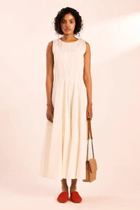 A white poplin dress with pintucks running from top to bottom, paired with a separate slip dress for added comfort and elegance.