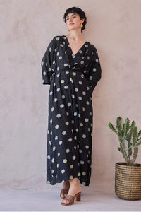 The Daisy Drift Kaftan Dress is a celebration of ease and quiet charm. Set against an inky black canvas, its delicate floral motifs bloom with soft contrast on the field of soft polka dots— a subtle nod to nature’s grace. Designed in a relaxed kaftan-like silhouette with a deep V-neckline, billowy sleeves, and gentle drape, this piece offers both comfort and quiet sophistication. Ideal for slow mornings, coastal strolls, or effortless resort elegance.