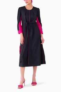 Introducing the Daisy Black Suiting Dress—a chic blend of sophistication and artistic flair. This elegant black dress features a striking 3D embroidered flower on the side and a drape knotted belt at the yoke, beautifully complemented by pink panels on the sleeves. With convenient side pockets and a side zipper, the fit-and-flare design ensures a flattering silhouette. Perfect for both day and evening events, this dress is a stylish addition to any wardrobe!