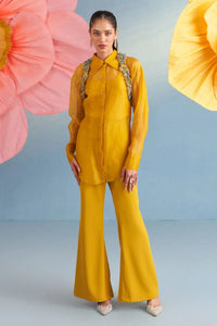 In a luminous golden yellow, the Daisy Coord Set is a three-piece ensemble — featuring a shirt, pants, inner, and bolero — crafted from pure silk organza and imported crepe. Embellished with hand-applied multicolour 3D florals, it blends playful charm with refined craftsmanship. A breezy yet polished look, perfect for festive gatherings and elegant daywear.