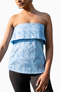 The Daisy top is a slightly long fitted bandeau top with concealed trims inside to keep it in place. It has intricate embroidery designs all over the body with a cape panel at the bust and its hip length.