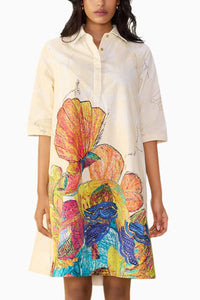 Featuring the Daisy Vera Dress by Saaksha & Kinni's Akara Collection A/W'25. A collared shirt dress in abstract print, merging classic structure with bold seasonal patterns for elevated everyday styling.