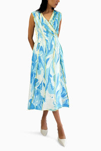 Meticulously crafted by artisans, the Daisy - Wrap Dress showcases a soft, hand-marbled light blue with delicate yellow accents. The near-calf hemline offers a sophisticated finish, perfect for both formal and casual occasions. Contrast stitching along the organic style lines adds a unique touch, emphasizing the attention to detail in every seam. This dress visible out stitch detail in contrast thread highlights the meticulous construction, proudly showcasing the inside-out approach that speaks to its exceptional quality.