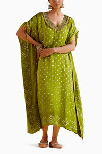 Green Kaftan in handcrafted bandhini , with peacock motifs and ghungroos embellished V neck, and tie-up detailing on the shoulders with ghungroos to create a stunning look!