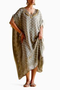Grey Kaftan in handcrafted bandhini , with peacock motifs and ghungroos embellished V neck, and tie-up detailing on the shoulders with ghungroos to create a stunning look!