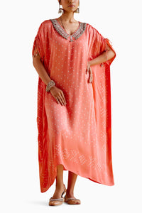 Peach orange Kaftan in handcrafted bandhini , with peacock motifs and ghungroos embellished V neck, and tie-up detailing on the shoulders with ghungroos to create a stunning look!