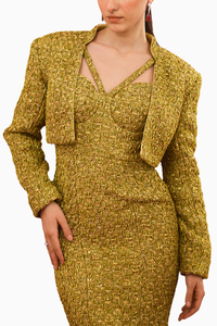 Featuring the Dalani Crop Jacket by House of Exotique. This open crop jacket has a mandarin collar and is crafted from lurex fabric in captivating chrome yellow. Padded for comfort and tailored for a perfect fit, it adds a touch of sophistication to any ensemble.