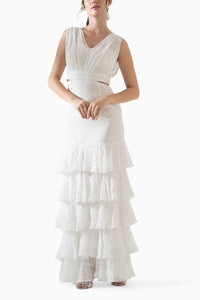 Dancers Delight is a maxi dress cut for those beautiful date nights and destination weddings for all the romantic souls. One of Designers favorite ensemble its crafted in viscose lurex and has romantic rouching on top bodice and then fitted till hips. The dress has dancer tiers from hips to the floor length.
