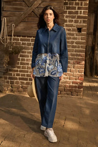 A perfect fusion of classic denim and intricate embroidery, this two-piece co-ord set is a must-have for the modern wardrobe. The structured denim shirt is elevated with a delicate floral embroidered panel, adding a touch of femininity to its timeless silhouette.