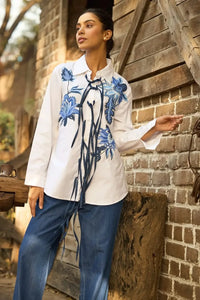 Turn heads with this exquisite white button-down shirt, adorned with handcrafted blue floral embroidery that adds a touch of artful sophistication. The highlight? Dramatic cascading denim tie details, creating a fluid, fashion-forward silhouette.