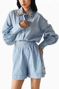 A chic blue striped set featuring an embellished collar shirt and matching shorts. Combines elegance with comfort for a polished yet relaxed look. Ideal for vacations, brunches, or stylish everyday wear.