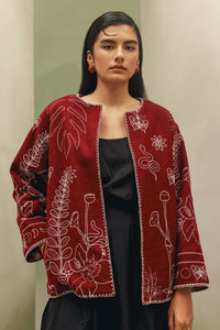 The Daria Jacket is crafted in rich wool felt, offering a warm, structured, and refined silhouette. Delicate embroidery inspired by the collection adds artisanal detail, while hand-finished blanket stitching enhances its handcrafted appeal. Designed for easy layering over dresses or tailored separates, it’s finished in a deep Burgundy shade for seasonal elegance.