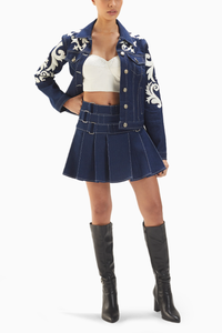 Dark Blue Leather Applique Denim Jacket With Pleated Skirt