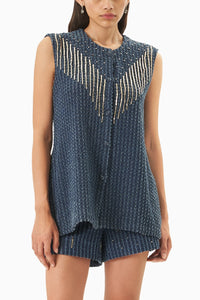 The Dark Lazercut Denim Sleeveless Vest with Cube Embellishment is a striking piece that merges edgy design with architectural detail. Crafted from dark-washed denim and enhanced with intricate lazercut patterns, this vest features bold cube embellishments that add a dimensional, futuristic touch. Its sleeveless silhouette offers versatile layering potential, making it a standout addition to any fashion-forward wardrobe.