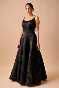 This elegant organza panel midi dress is designed with a body-skimming fit through the bodice that flares into a gracefully voluminous skirt, creating a flattering and feminine silhouette. Featuring a rich leaf print throughout, lending it a refined and sophisticated look. The delicate straps are embellished with finely embroidered leaf details, adding an artisanal touch to the overall design. With its timeless appeal and subtle craftsmanship, this piece perfectly blends elegance and modernity.