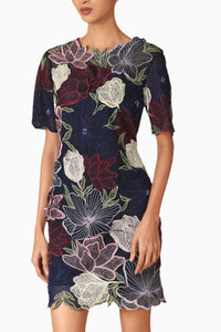 Introducing Shriya Som's multi-floral bodycon dress from the Chrysalis Collection, crafted in a tulle base and adorned with signature multicolor floral motifs and intricate embroidery. Accentuated with stunning crystal embellishments for a dazzling finish.
