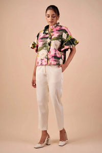 Make a statement with this cotton ruffle shirt, showcasing an in-house smudge floral print and voluminous sleeves for a touch of playful drama. Paired with clean-cut cotton straight pants, the look balances bold artistry with refined simplicity—perfect for effortlessly chic, everyday elegance.