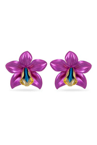 Make a bold statement with the Valliyan Metallic Orchid Earrings in dark purple. Crafted from copper and brass, these striking orchid-inspired earrings feature a rich metallic finish, enhanced with 22k gold or white rhodium plating—perfect for adding deep, elegant color to any look.
