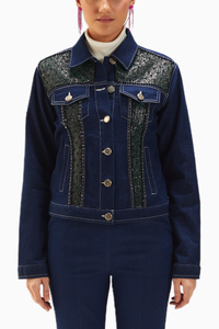 Elevate your style with our Dark Wash Blue Mesh Denim Jacket featuring a luxurious fur collar. Crafted from stretch denim, it's a perfect blend of comfort and fashion-forward design.